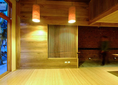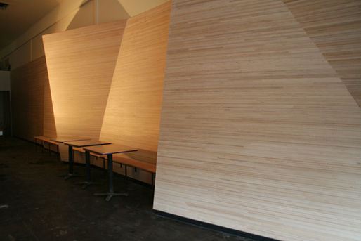 Oblique City sourced locally reclaimed lumber as the dominant finish material for the entire space. The walls and ceiling soffit were fabricated from large planks of salvaged eucalyptus--painstakingly ground and polished--which were carefully chosen for their large splits and cracks, revealing their age and . The sushi bar itself--the focal point of the entire space--consisted of one 30' slab of salvaged Elm.