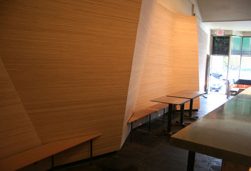 The challenge for this small restaurant was to take the dining area's tiny footprint and create multiple types of spaces, with varying levels of intimacy. To achieve this, Oblique City fabricated large triangular forms to break up the space and create small nooks for different sized parties. The forms consisted of stacked layers of Russian Birch plywood, fabricated on site. For the bar itself, Oblique City custom fabricated a concrete counter in place.